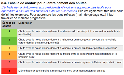 | 50’ | Les participants qui n’ont pas encore pu le faire font le « step by step » par cordées de 3 avec le contre-assurage d’un participant (voie facile pour terminer l’échauffement) Exercice de chutes avec contre-assurage de l’instructeur par cordées de 2 : Chutes plus importantes dans le 3ème secteur : échelle de confort 4 à 6 Chutes non averties : durant la montée, le grimpeur réalise quelques chutes sans avertir l’assureur. Règle à respecter : ne jamais chuter juste avant de mousquetonner avec le mou en main Remarque : suite à cet exercice, un participant peut être considéré comme « formé avec peu d’expérience » par l’instructeur et grimper en autonomie dans la salle sous la surveillance de l’instructeur | . Choisir des voies faciles pour les exercices de chute . Astuce : pour le timing, proposer à l’assureur de fermer les yeux ou de ne pas regarder le grimpeur (regard fixe devant soi) . Les exercices 2.1 et 2.2 permettent au grimpeur et à l’assureur de prendre confiance dans le fait de chuter et d’être retenu en cas de chute et également d’expérimenter des chutes plus importantes ainsi que l’effet de surprise en cas de chute non averties. Ces chutes ne sont pas obligatoires, c’est l’instructeur qui propose et dose les chutes en fonction des participants . L’instructeur fait un bilan individuel durant cette partie à chaque participant. Si nécessaire, orienter vers un cours supplémentaire |